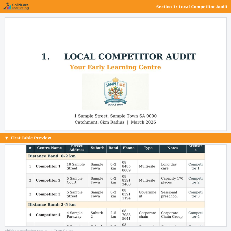Local Competitor Audit – A comprehensive census of every competing childcare centre within your selected km catchment area of Your Early Learning Centre